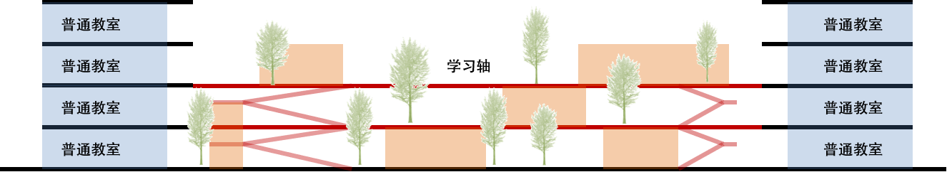 同样的一条多功能学习轴将普通教室和专业教室相对集中,形成丰富的教学组团,位于校园核心位置。