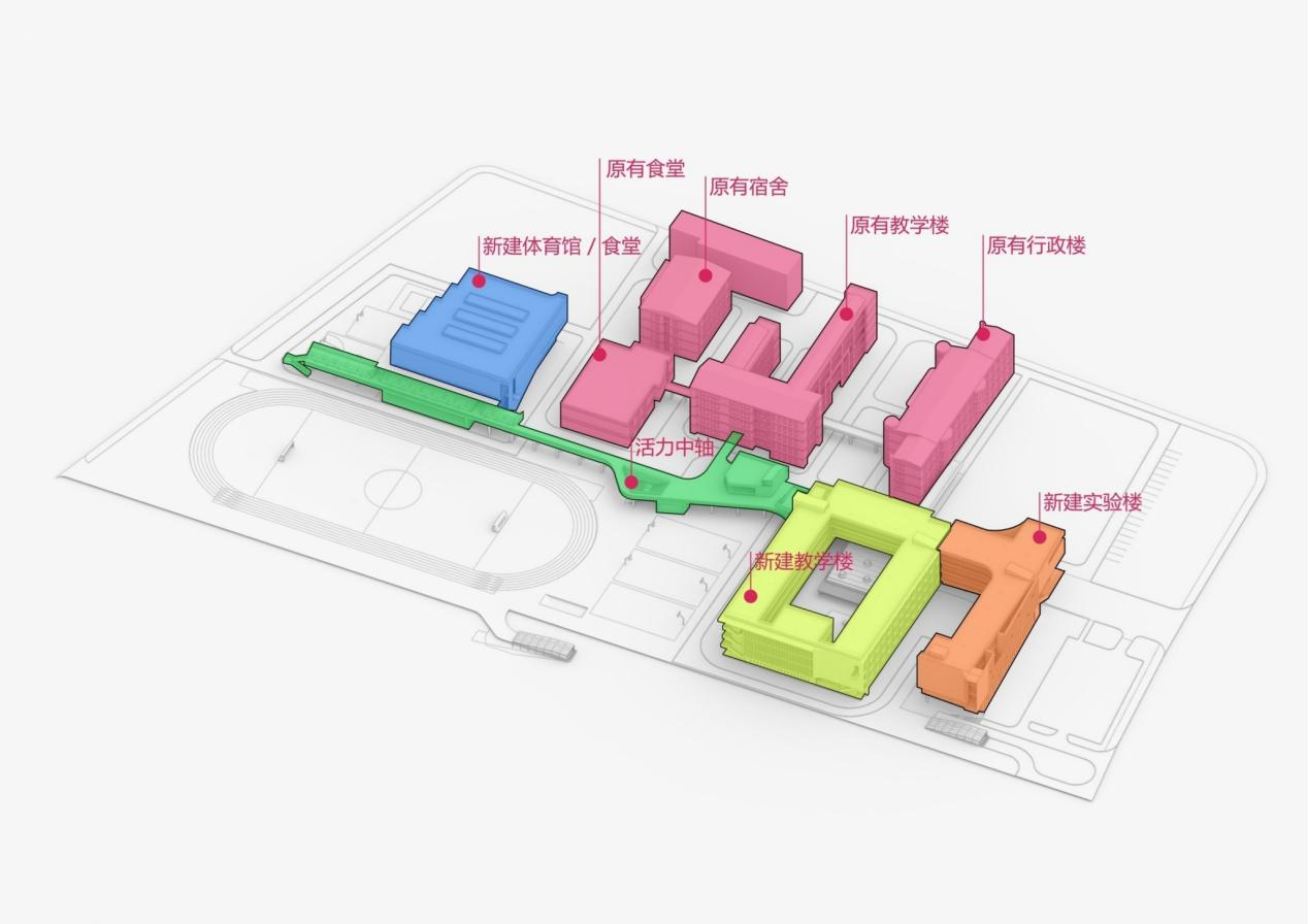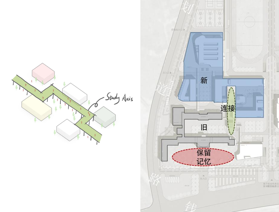 同样面临新老校区如何串联的问题。同时,中学生学习压力陡增,相应的要求空间更为集中高效。