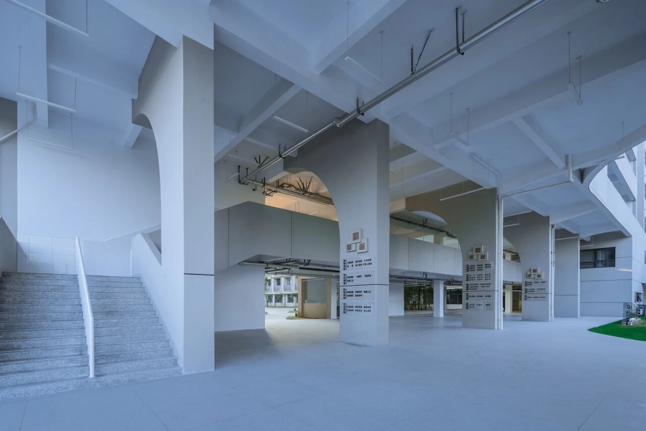 教学楼相对集中,形成丰富的教学组团,巧妙布置的专业教室穿插其中,形成活力中轴,丰富空间体验,同时利用纵深解决了南北场地过长的问题。