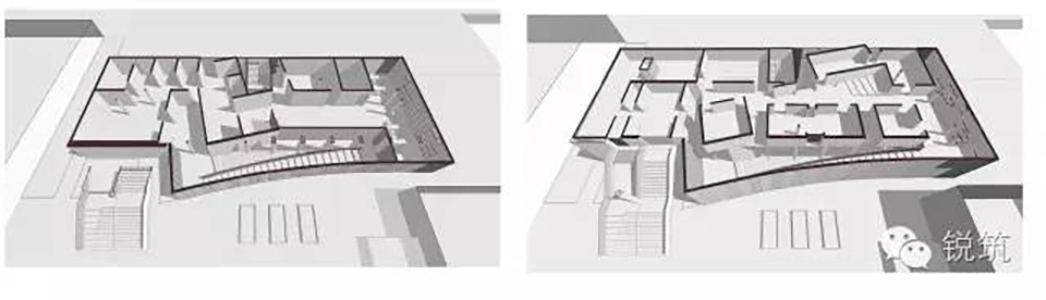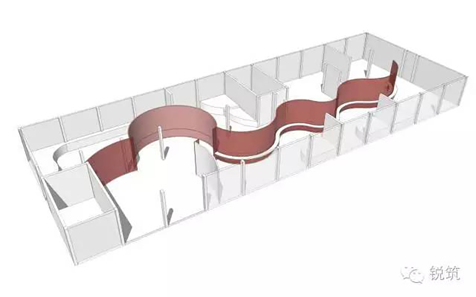 接触项目的时候,业主已经有了一个即将施工的方案。原设计在矩形平面中用一道弧线进行分割,形成一个单向而闭合的空间。弧线的导入非但没有让空间活跃,反而更加剧了和原有结构的冲突,同时也强制了参观者的活动方式。形式上的流畅和实质上的沉闷是给我的强烈印象。而与之对抗,创造一个自由的空间,让参观者拥有选择权进而忘却建筑的存在是设计的对抗性反应。