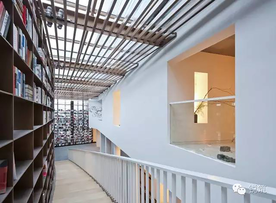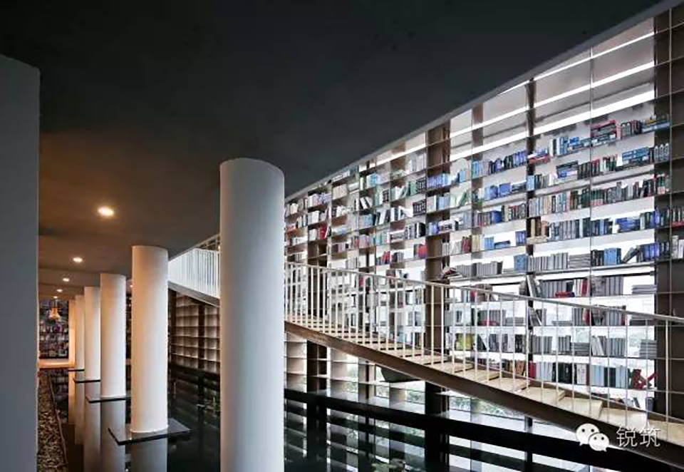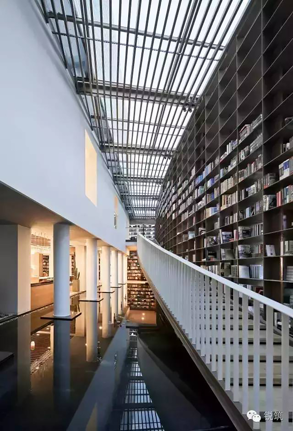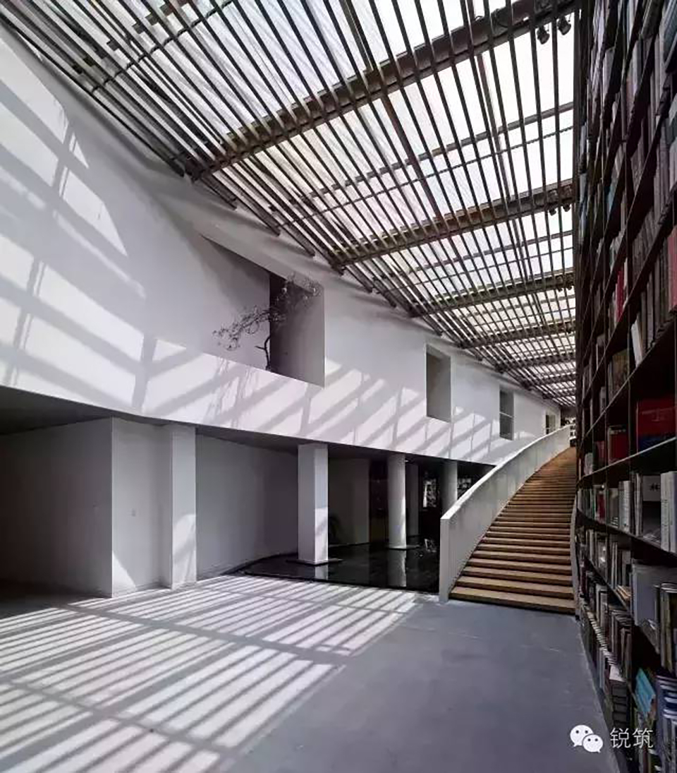 建造:在局部打开二层楼面后,建造的重点就是外加的楼梯空间。这是整个建筑的高潮,也类似于园林中的中央庭院。所有的一切活动都以此为中心展开。中厅空间是以书架墙为表皮,以钢板为构造元素建造而成,连接上下的楼梯无疑是整个空间的焦点。